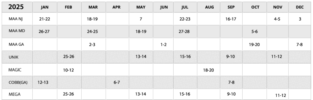 *Please note that our show schedule is subject to change. Show Info MAA SHOW (NJ) www.maashow.comMAA SHOW (MD) www.maashow.comCHICAGO (IL) www.unikshow.comCOBB (GA) www.cobbtradeshow.comMAGIC (NV) www.magiconline.comMEGA (IL) themegashow.com/ 20242023202220212020