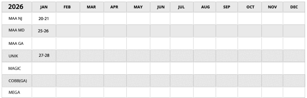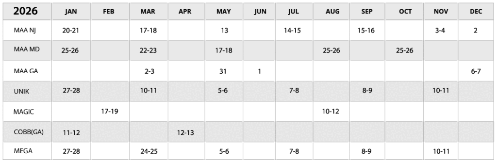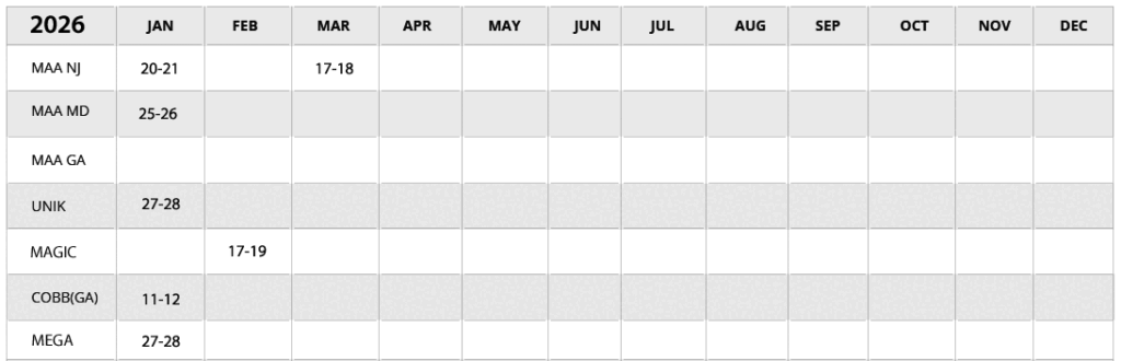 *Please note that our show schedule is subject to change. Show Info MAA SHOW (NJ) www.maashow.comMAA SHOW (MD) www.maashow.comCHICAGO (IL) www.unikshow.comCOBB (GA) www.cobbtradeshow.comMAGIC (NV) www.magiconline.comMEGA (IL) themegashow.com/ 202520242023202220212020